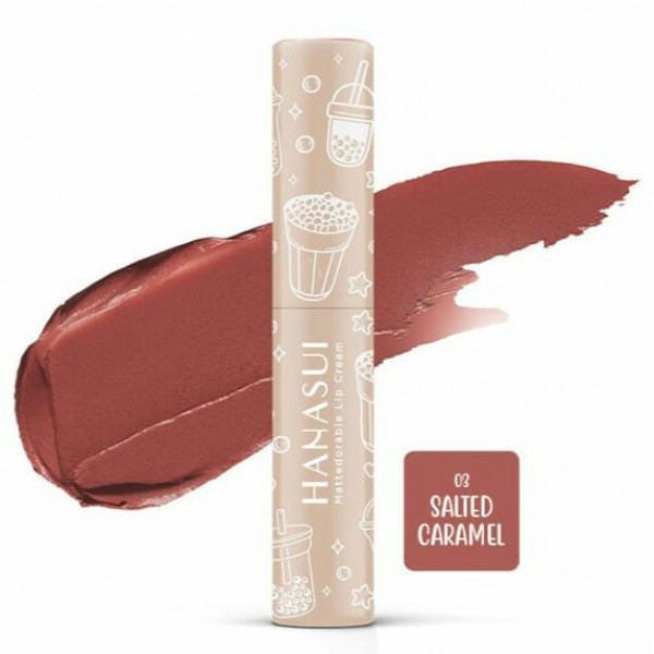 HANASUI MATTEDORABLE LIPCREAM Salted Caramel Dengan finishing velvet yang ringan dan formula yang tahan lama, pigmen sempurna, dan nyaman di bibir disertai kandungan Olive Oil & Vitamin E yang membuat bibirmu terhidrasi dengan baik.