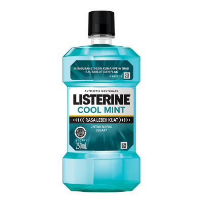 Listerine Cool Mint 250ml adalah produk penyegar mulut yang memiliki 4 kandungan essensial oil. Kombinasi 4 essensial oil ini dapat memberikan kesegaran pada mulut selama 24 jam. Kesegaran menyejukkan dari rasa mintnya akan dengan efektif melawan kuman penyebab plak pada gigi dan bau mulut yang mengganggu. Kumurlah dengan Listerine Cool Mint 250ml dua kali sehari setiap sehabis menyikat gigi dan hadirkan napas segar Anda sepanjang hari.