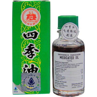 SHEN NONG SI Four Season Medicated Oil 12 ml merupakan minyak herbal yang berfungsi membantu mengurangi gejala flu, sakit kepala, dan pusing, sakit perut, diare, mual dan muntah, digigit serangga, mabuk perjalanan dan lain-lain. Selain itu dapat meredakan pegal-pegal dan nyeri otot.