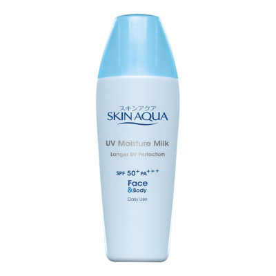 SKIN AQUA UV Moisture Milk SPF50+ merupakan Krim Sunscreen untuk wajah yang dipergunakan untuk melindungi wajah kita dari sengatan matahari, dan selain melindungi wajah dari paparan sinar matahari juga dapat mencerahkan wajah dan mencegah penuaan dini. Dengan kandungan Improved Hyaluronic Acid yang memberikan kelembaban dan kelembutan extra pada kulit. Dan kandungan collagen nya menjaga elastisitas kulit, serta kandungan B5 dan E menutrisi kulit hingga ke dasar kulit. SPF 50+ nya memberikan perlindungan 51x lebih lama terhadap sinar UV-B yang dapa menyebabkan kulit merah karena terbakar sinar matahari dibanding kulit yang tidak di lindungi. Sunscreen ini tidak menggunaan zat pewarna dan parfum sehingga aman untuk kulit anda.
