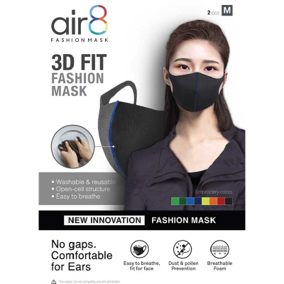 air8 3D Fit Fashion Mask M 2 pcs merupakan masker yang dapat di cuci dan dipakai ulang. Hadir dengan bahan yang memudahkan anda untuk tetap bernafas dengan nyaman. Fit dengan shape wajah sehingga membuat anda tetap terlihat fashionable. Hadir dengan ukuran M yang cocok untuk wajah berukuran sedang.